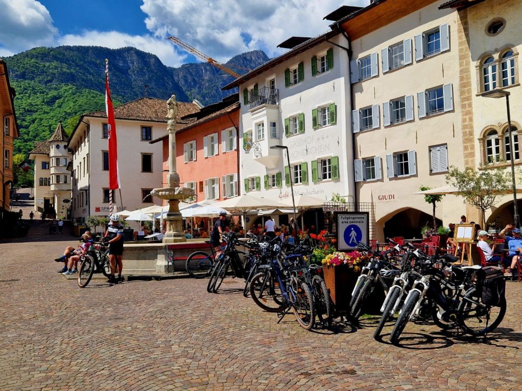 Es geht wieder aufs Rad – der Mendelpass ruft! Eine legendäre Route unter Südtirols Pässen, gespickt mit Kurven, Höhenmetern und Ausblicken, die jede Schweissperle wert sind. Oben angekommen, fühlt man sich wie eine kleine Gipfelheldin – zumindest bis zur rasanten Abfahrt. Zurück im Tal legen wir eine Kaffeepause in Kaltern ein. Der Dorfplatz ist gut gefüllt – eigentlich überfüllt. Überall Fahrräder, Menschen, Stimmengewirr. Nach der stillen Beschaulichkeit der letzten Tage war mir das einfach zu viel.